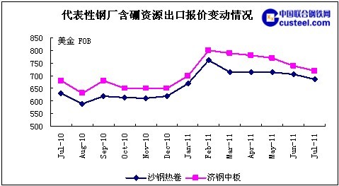 三是國內鋼材產量快速增長,粗鋼日均產量創歷史新高,出口競爭加劇。國家統計局本周發布數據顯示,6月我國粗鋼產量為5993萬噸,日均產量達到199.8萬噸,環比增長2.8%。鋼廠為爭奪有限訂單大打“價格戰”,競爭逐步加劇,效益下滑致使企業出口積極性降低。例如,7月國內鋼廠含硼熱卷主流出口成交價已下滑至690美元以下,較上月跌了10-20美金,個別企業甚至出現了670美金的超低價格,而含硼中厚板主流報價也下調至700-710美金。
